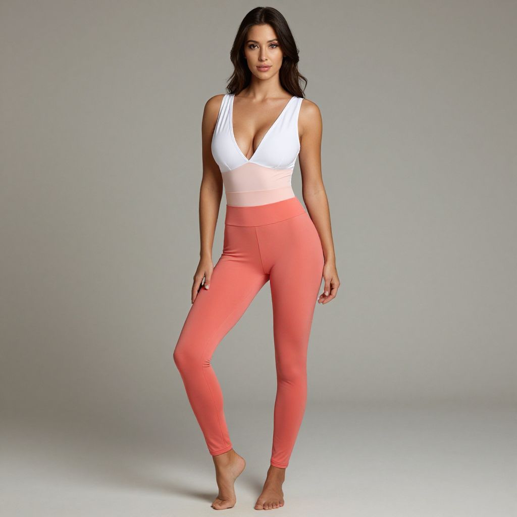 Photograph of a confident woman with long black hair, wearing a white deep V-neck top and coral high-waisted leggings, standing barefoot against
