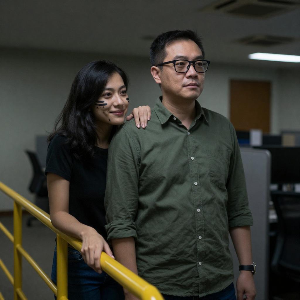 Photograph of an Asian man with glasses and a green shirt, and a woman with black hair and face paint, standing closely in a dimly lit office building. The woman leans on the man's shoulder, smiling, while he looks forward. A yellow handrail and office furniture are in the background.