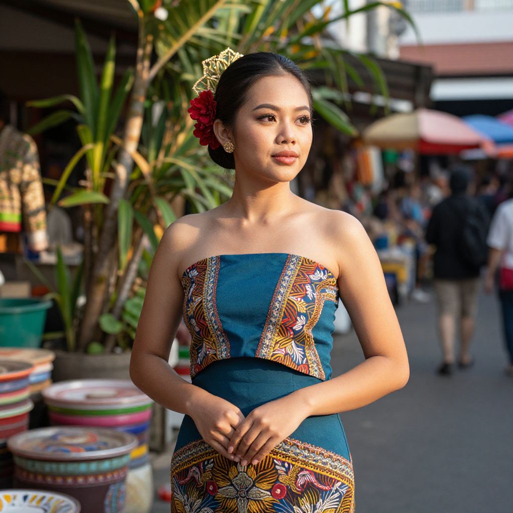 Pretty Filipino woman standing gracefully in a vibrant traditional market, wearing a colorful modern Filipiniana dress, warm sunlight casting soft shadows, lush tropical plants in the background, intricate details in her floral accessories, serene and confident expression