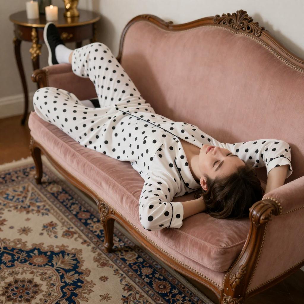 Person in polka-dot pajamas with white socks and black shoes, lying on a pink, ornate couch. Wooden side table with gold decorations and candles. Richly patterned carpet. Gold statue in the background. Intense, relaxed facial expression. One person.