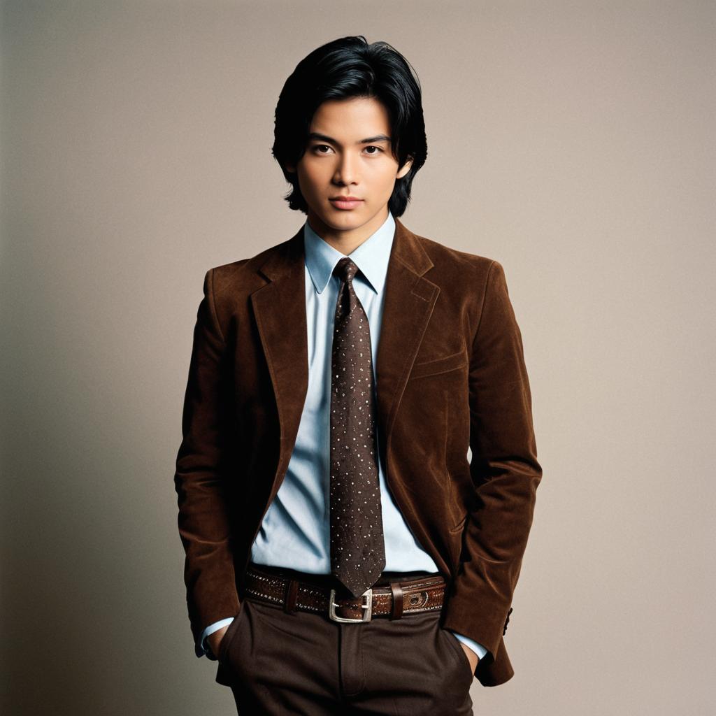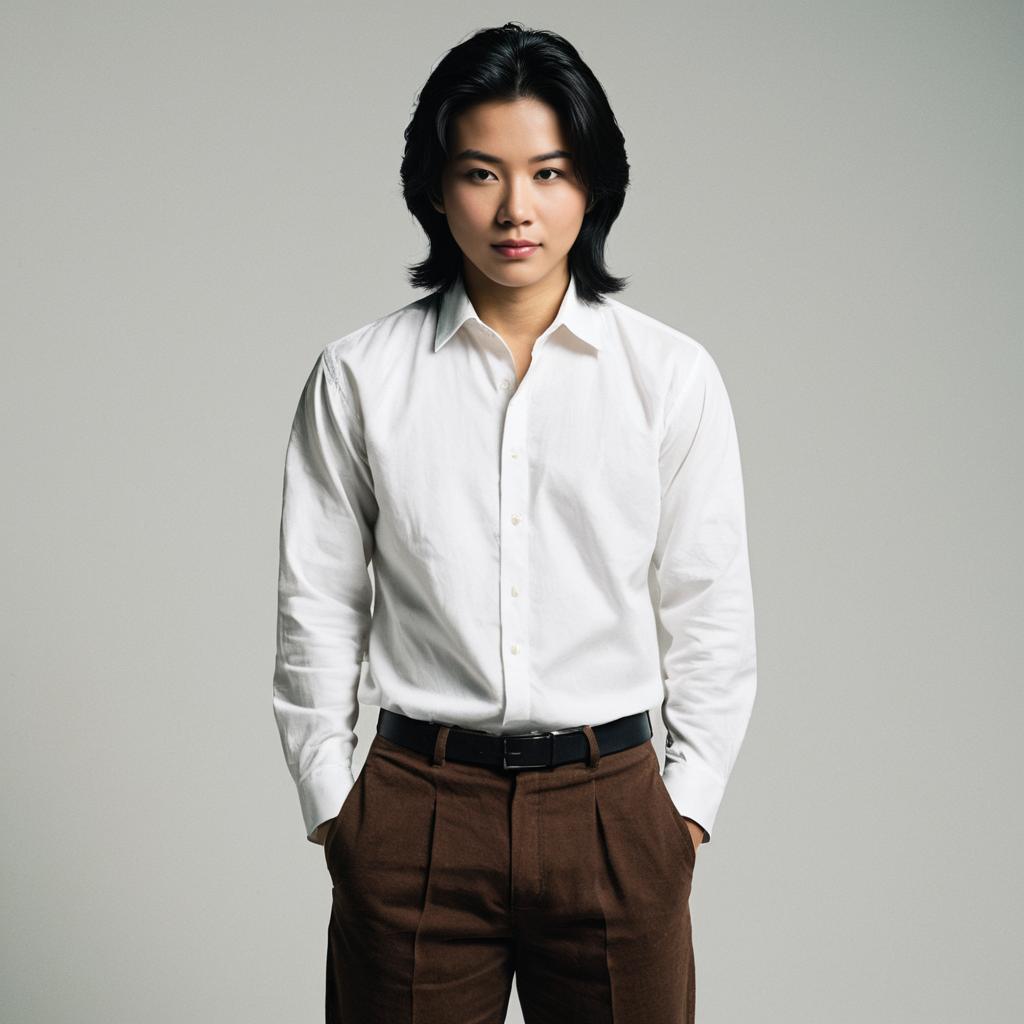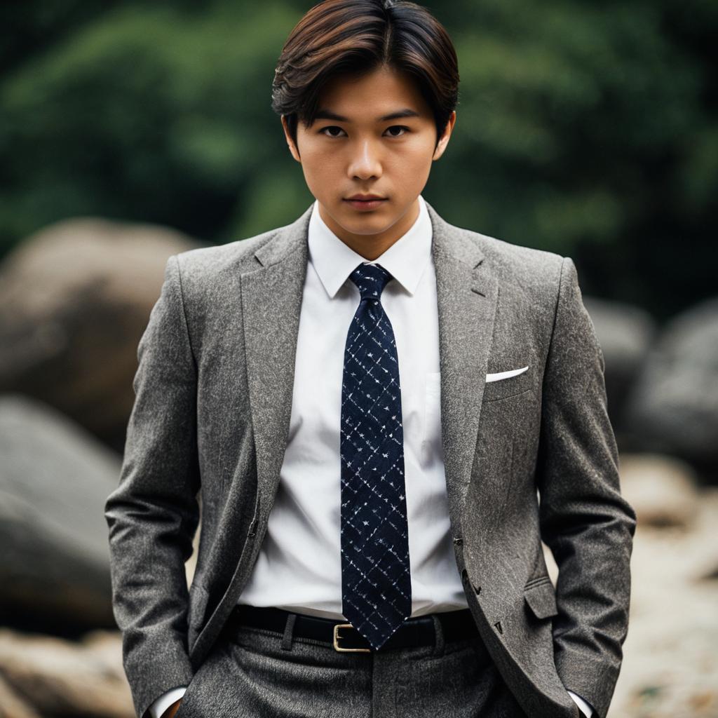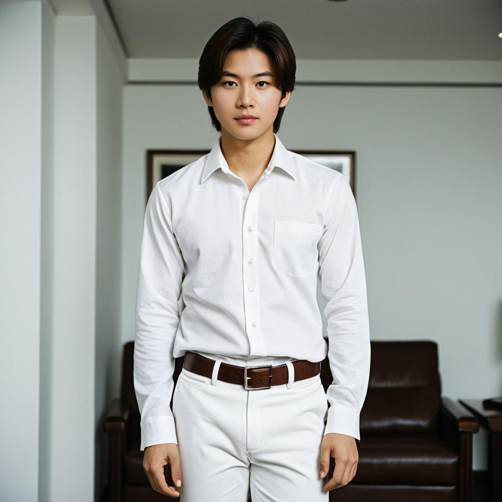Portrait of a young Asian man wearing a white collared shirt, red necktie, grey pants, and a brown belt standing outdoors in a grassy field with blurred trees in the background. He has short, neatly styled black hair and a serious expression, looking directly at the camera.
