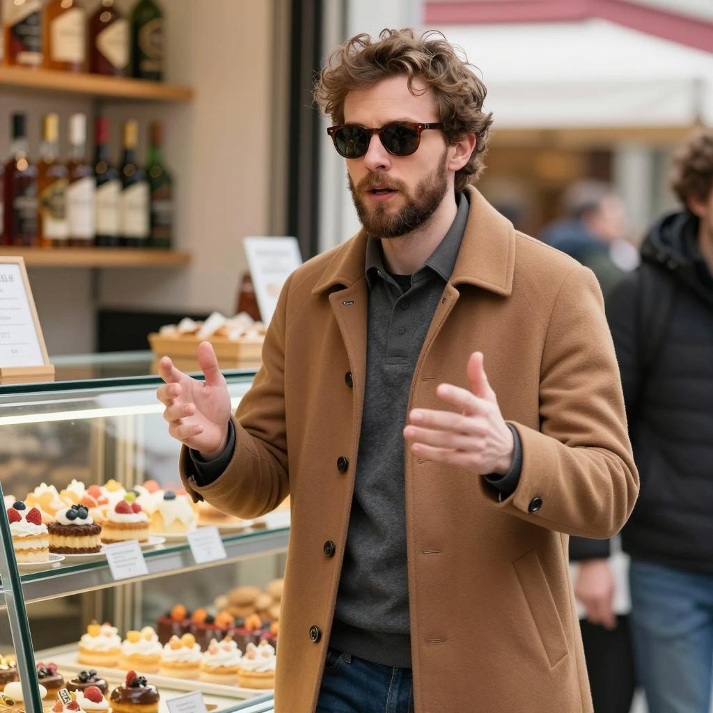 Five men at a bar counter. First man in gray hoodie, second in red beanie and green jacket, third in plaid shirt, fourth in blue denim jacket with red shirt, fifth in black jacket. First man with intense expression, second man smiling, third man neutral, fourth man talking, fifth man looking at phone. Bottles, glasses, and metal shaker on counter. Background with hanging lights and wall decor.