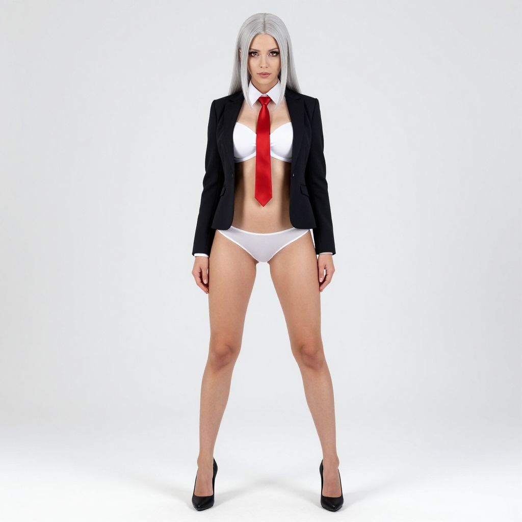 Masterpiece, best quality, (good anatomy:1.2), (1girl:1.1), elf, perfect body, perfect eyes, standing, (wide hips:1.1), business suit, (red tie:1.1), tall, (mature woman:1.3), black high heels, full shot, full body, long hair, silver hair, red eyes, white backround, simple backround, white panties, white bra, looking at viewer