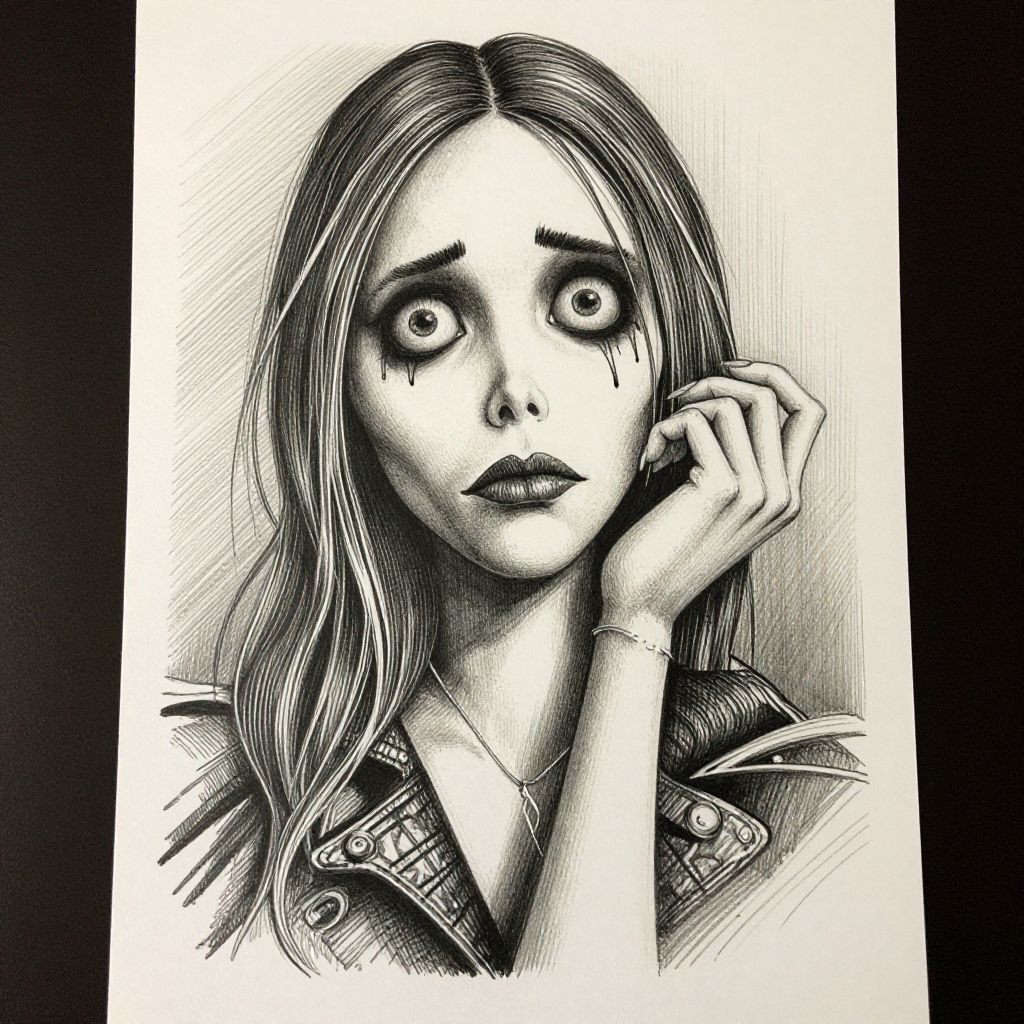Black-and-white digital ink drawing of a wide-eyed, worried young woman with long hair, wearing a denim jacket, touching her cheek. Distressed expression