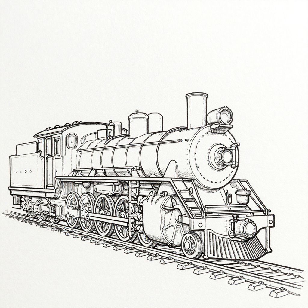 Steam train outline, artistic line drawing showcasing a towering steam locomotive chugging on rails, elegant linear patterns emphasizing wheels and pistons, timeless industrial design in crisp black ink, clean and refined minimalist style on textured paper