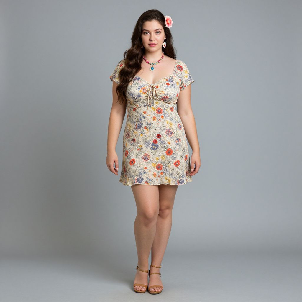 Photograph of a young woman with long, wavy black hair standing against a plain, light gray background. She is wearing a strapless, white lace dress that reaches mid-thigh, adorned with intricate lace patterns and a fringed hem. She stands with her legs slightly apart, barefoot, and looks directly at the camera with a neutral expression. She wears a simple black necklace with a small pendant. Her skin tone is medium brown, and she has a slender build. The overall style is minimalistic and elegant, highlighting the lace dress's delicate details.