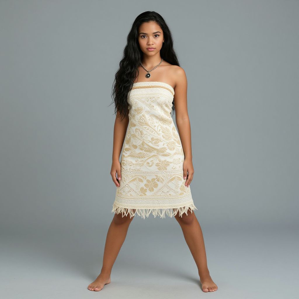 "moana character adult, 1girl, solo, barefoot, long hair, black hair, jewelry, dress, braid, standing, necklace, bare shoulders, full body, strapless, parody Realistic photo of casual sexy person with pretty face"