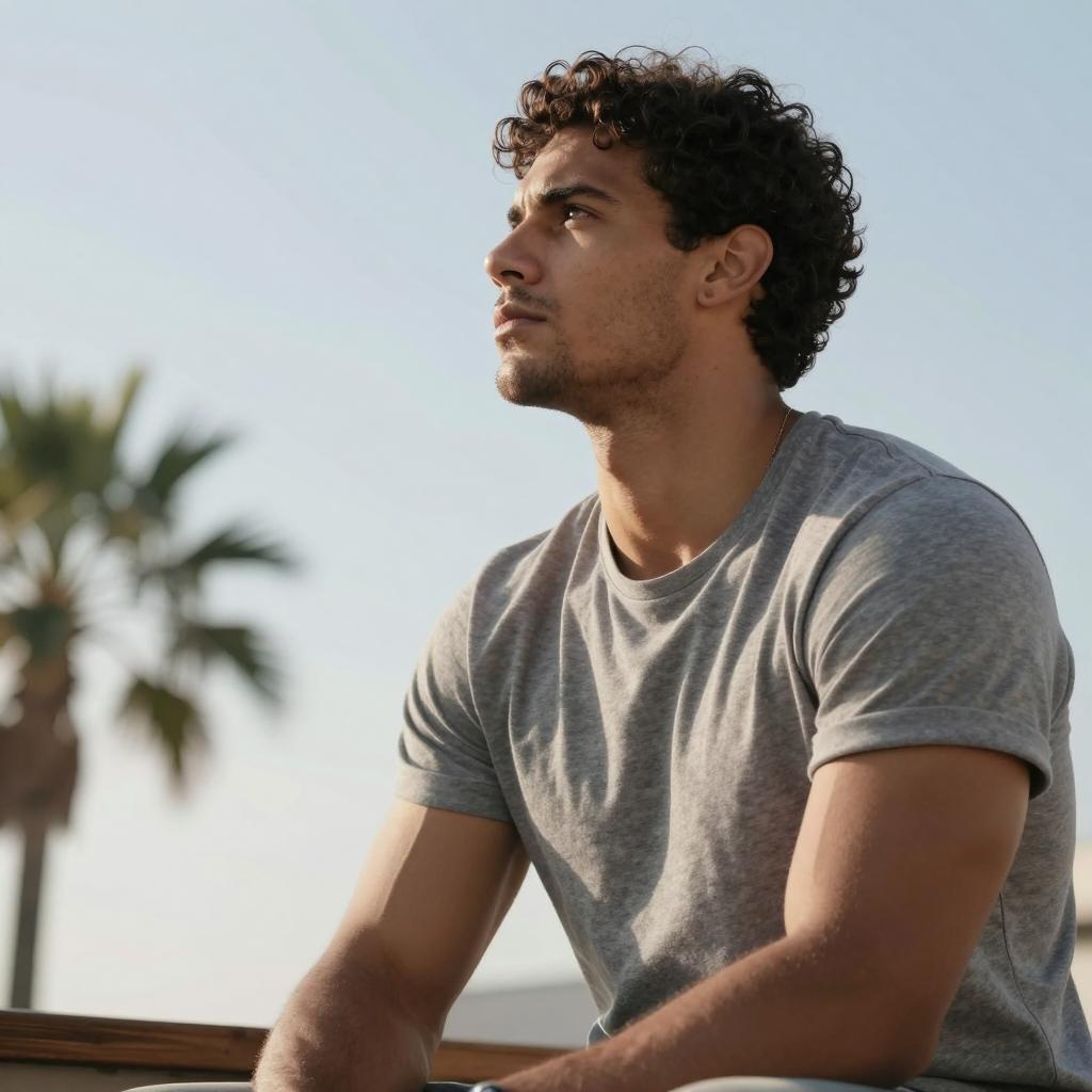A muscular man with curly dark hair, light skin, and defined jawline. He wears a gray, slightly wrinkled t-shirt. He is in a profile view, looking upward with a serious expression. Background includes a clear sky and a palm tree on the left. The man is seated, with a wooden surface in the lower part of the image.