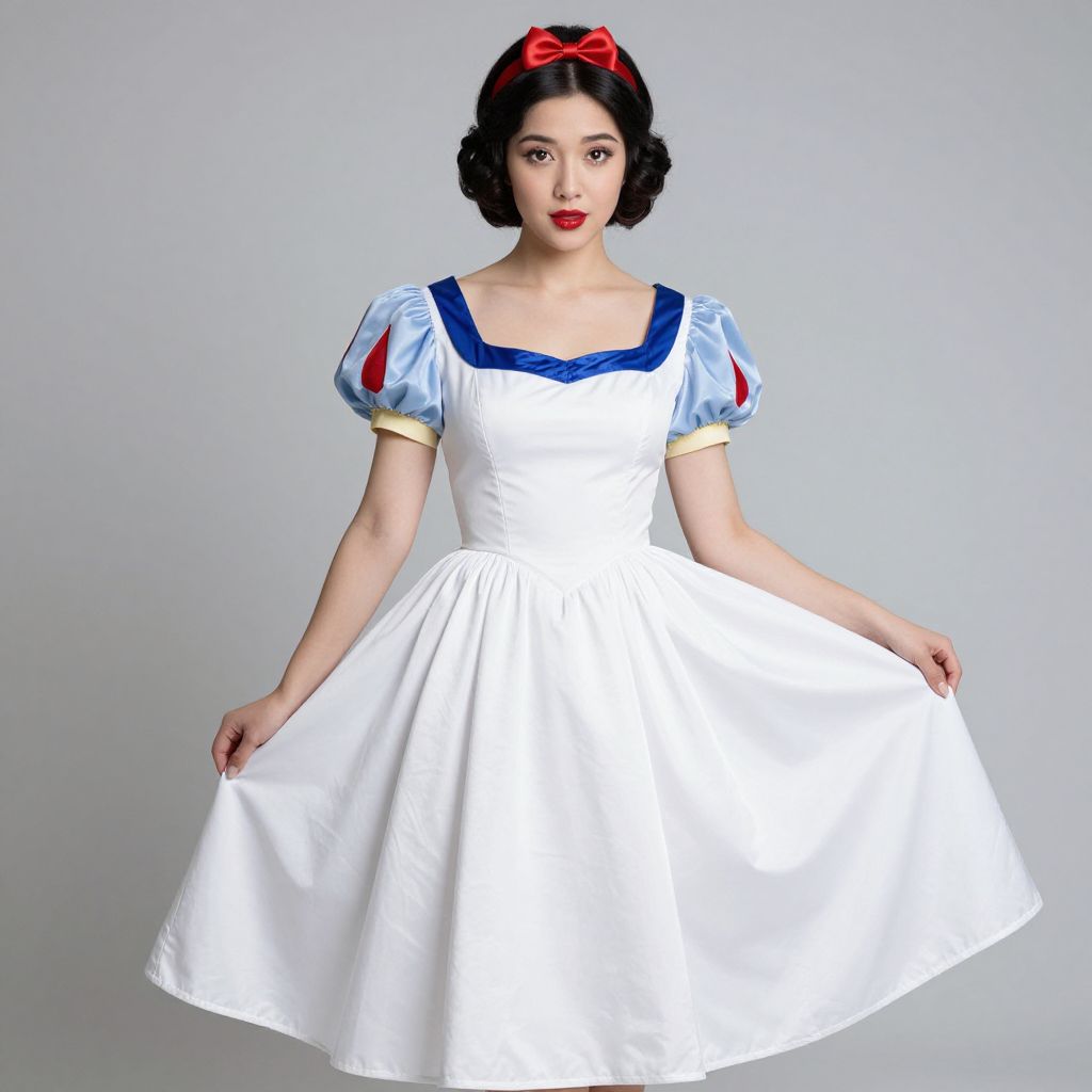 Snow White Frock, woman in a white dress with blue trim and red lips