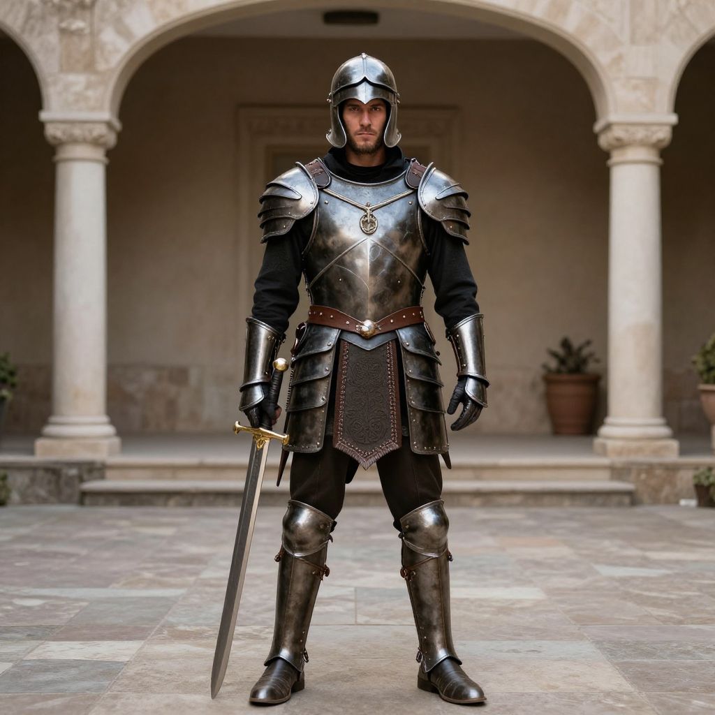 Gladiator halloween costume, man in armor standing in a courtyard with a sword
