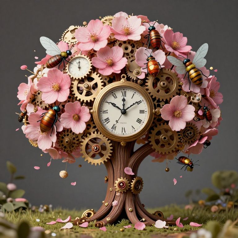 A digital artwork of a whimsical clock tree stands in a grassy field. The tree's trunk is adorned with brass gears, and its branches are filled with pink cherry blossoms. Bee and butterfly figures, with translucent wings, are interspersed among the flowers and gears. A central, vintage-style clock with black Roman numerals and black hands is prominently displayed. The background is a blurred, dark gradient, focusing attention on the intricate, steampunk-inspired clock tree. Pink petals float around the base, adding a delicate touch. The overall style is a blend of steampunk and fantasy.