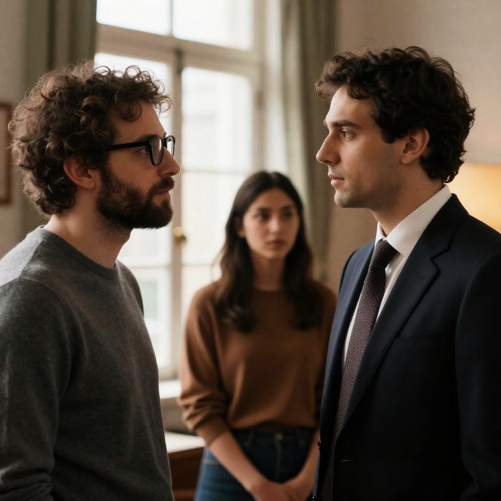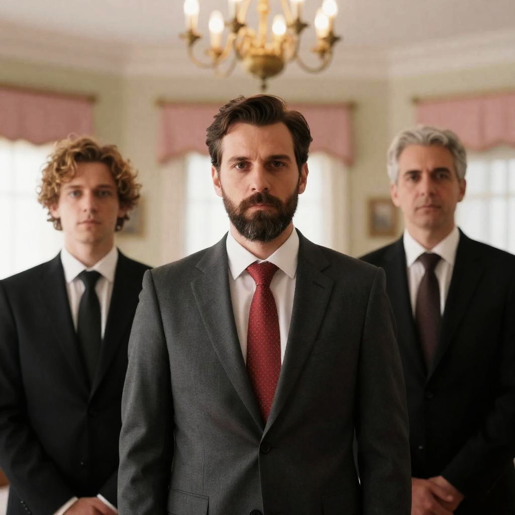 Photograph of three men leaning on a metal railing. First man, brown jacket, dark shirt, blue scarf, casual. Second man, gray hoodie, white tee, leaning forward. Third man, gray suit, blue tie, arms crossed. Background: two black-and-white framed photos. Second man's beard, third man's short hair, first man's dark hair. Casual and professional attire. Intense expressions.