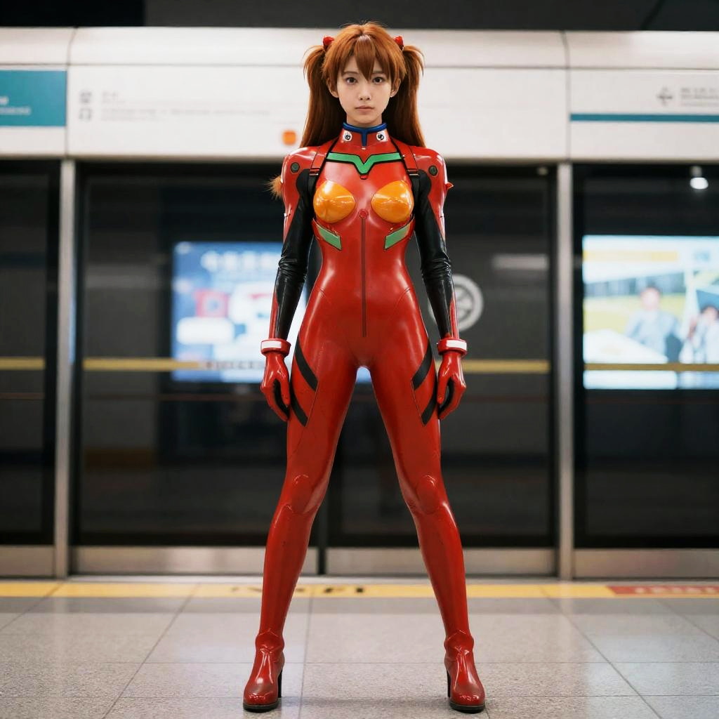 Asuka Langley, woman in red and green costume standing in a subway station
