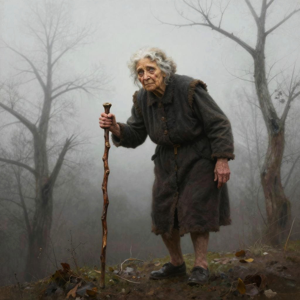 An ugly old woman with deep wrinkles and weathered skin, sitting alone on a wooden bench in a gloomy forest, wearing tattered clothes and a faded shawl, under a cloudy sky, highly detailed, dramatic lighting, realistic style