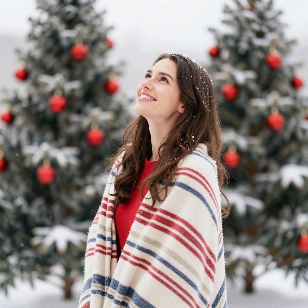 Photograph of a smiling woman with curly brown hair, wearing a maroon belted coat over a white sweater, standing in front of a snow-covered Christmas tree with purple and gold ornaments and warm string lights. She has hands in coat pockets. Snow on ground and tree branches.
