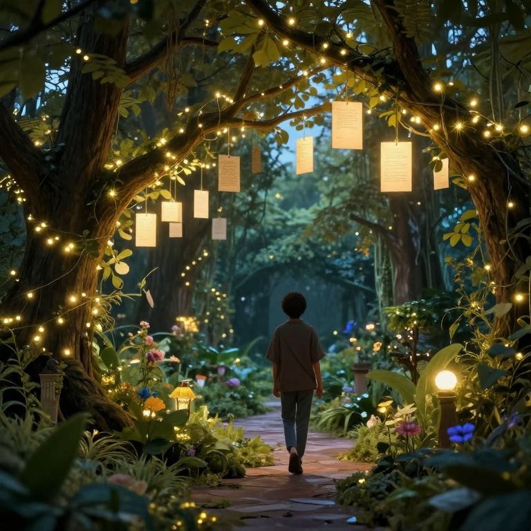 A digital illustration depicting a person with short black hair, dressed in a dark brown shirt and blue jeans, walking down a winding, illuminated forest path. The path is framed by large, arching tree branches adorned with twinkling fairy lights and hanging paper lanterns. The surrounding forest is lush with vibrant flowers, greenery, and dim, blue twilight light filtering through the trees. The scene is magical and serene, with the soft glow of lanterns and lights creating a warm, enchanting atmosphere.