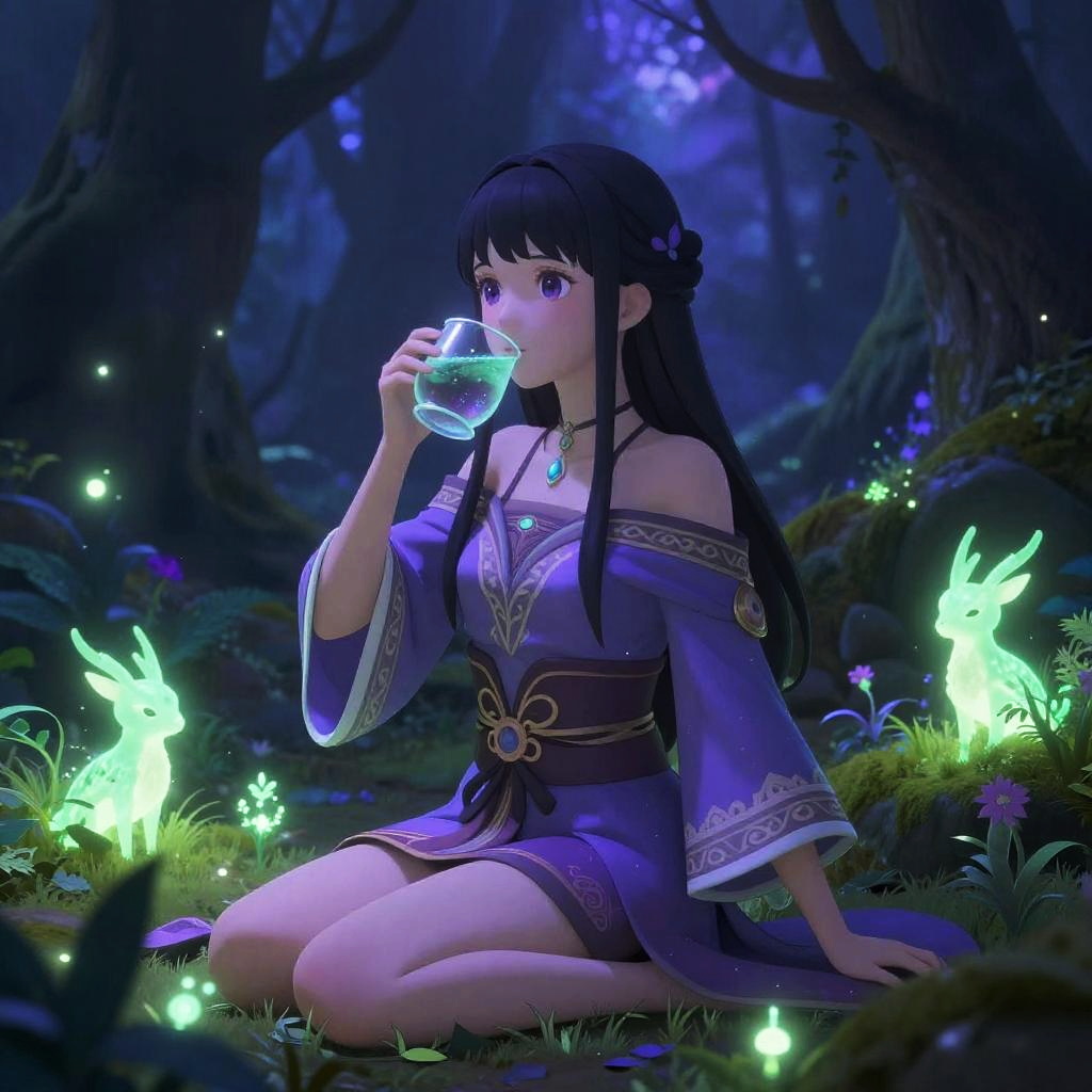 Anime girl drinking a potion in a mystical forest, surrounded by glowing plants and magical creatures, ethereal lighting with shades of purple and green, fantasy-inspired attire with intricate patterns, mysterious and enchanting atmosphere.