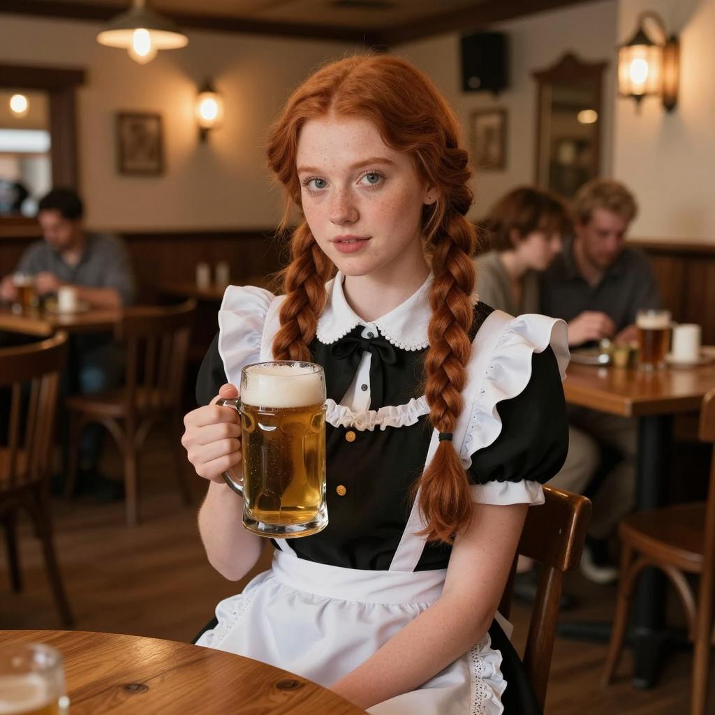Young woman with long braided red hair wearing a classic black and white maid outfit, seated in a warmly lit tavern with wooden floors and tables. She is holding a frothy glass mug of beer, with expressive eyes and delicate features softly highlighted. The cozy pub atmosphere includes patrons sitting at tables in the background under warm ambient lighting.