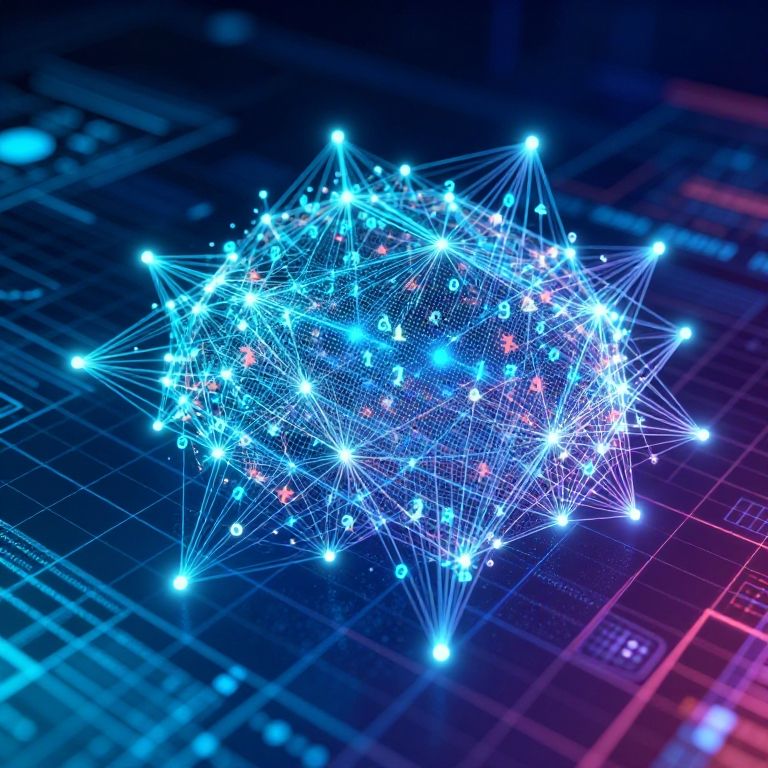 Digital illustration of a glowing, blue and white network of interconnected stars and nodes on a dark, grid-patterned background.