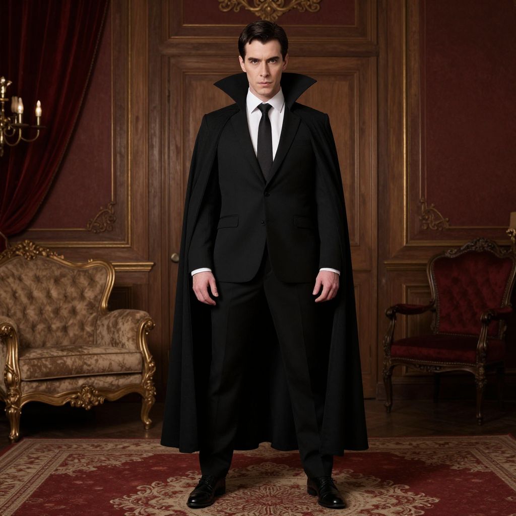 Dracula Cape Costume, man in a black suit and tie standing in a room