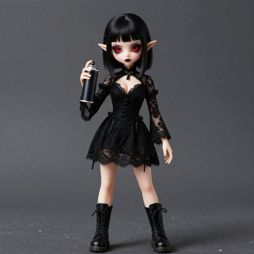 Realistic photo.Cartoon illustration of a gothic girl, with straight jet-black hair, red eyes, wearing a black lace dress and combat boots, dark fantasy style, with revealing extra-large cleavage, holding a spray can. realistic photo