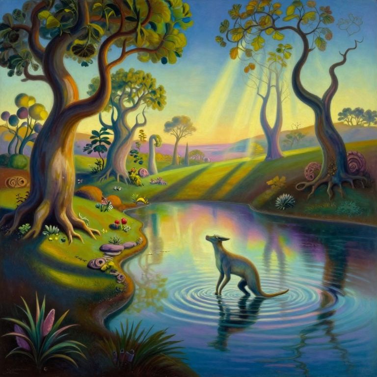 Vibrant digital painting of alien creatures with shiny exoskeletons, standing by a reflective river at sunset, surrounded by trees. Whimsical