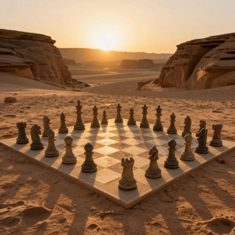 An ancient chessboard etched into the earth, its sentient stone pieces stand silent sentinels under the golden glow of the setting sun, embodying the eternal dance between fate and freedom, where each move is a whisper of destiny echoing through the canyon's timeless silence.