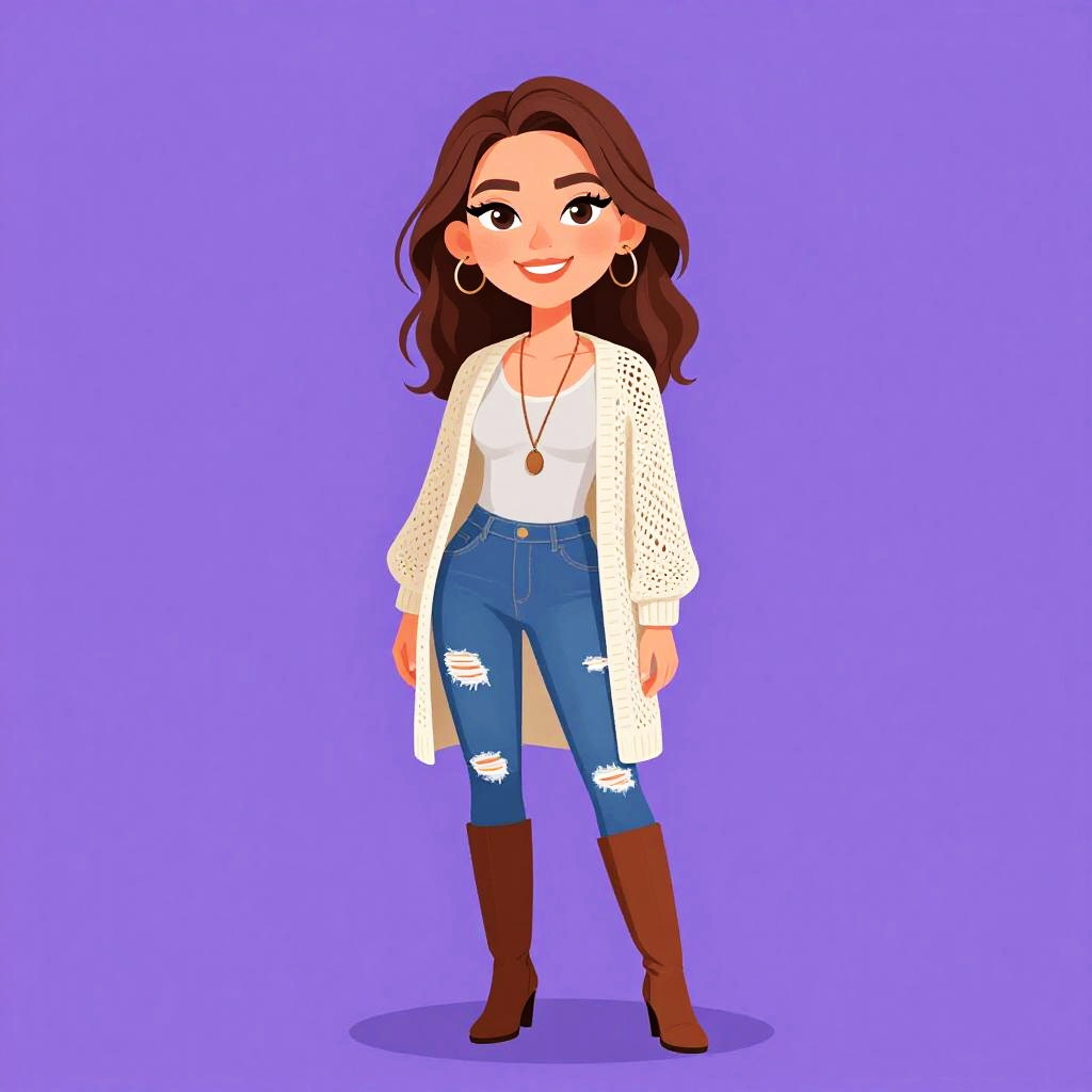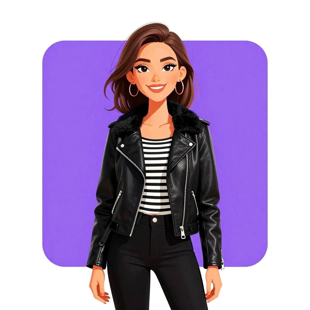 Woman with pretty face and pretty hair. smiling Woman, casual chic, black leather biker jacket with faux fur collar, diagonal zipper, long sleeves, striped black and white boat-neck top underneath, slim-fit black pants, white background. --sref 1461