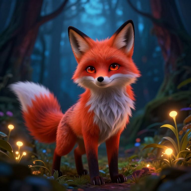 A digital illustration of a cute, fluffy red fox with white underbelly and black-tipped ears and legs, sitting by a glowing campfire at night. The fox's fur is detailed with realistic texture, and it gazes forward with a gentle expression. The background is a dark, starry night with silhouetted trees. The fire illuminates the fox's face and fur, casting warm orange and yellow light. The ground is covered in grass and scattered rocks. The overall style is realistic with a touch of whimsy, emphasizing the fox's charming appearance.