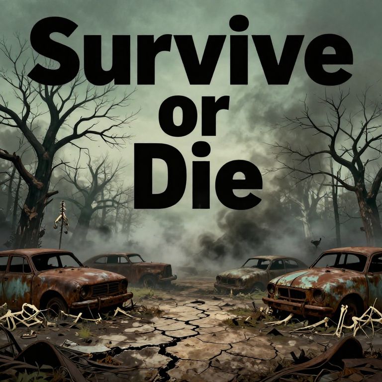 Digital artwork: "Survive or Die" text in bold black letters over a foggy, abandoned, rusted car graveyard with leafless trees and