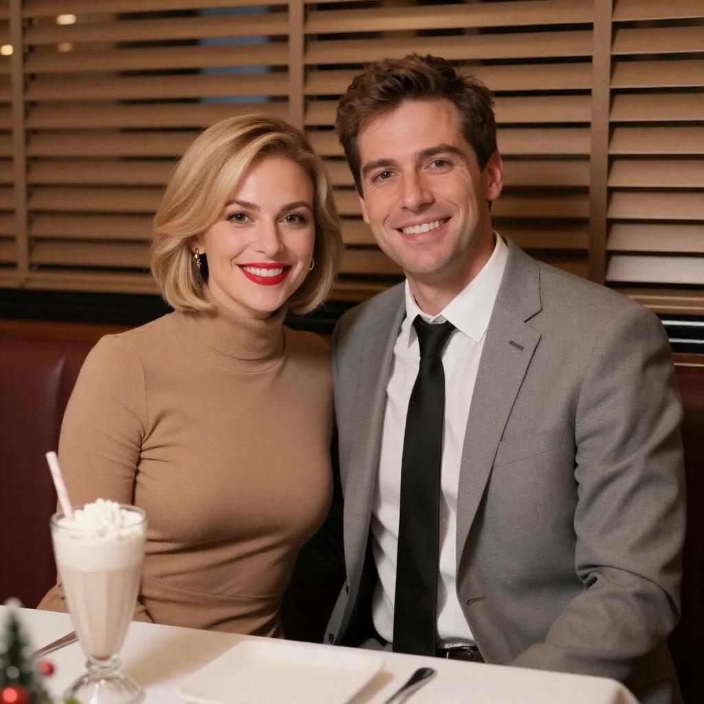 Photograph of a bride and groom. Groom, with brown hair and medium build, in black suit, gray vest, and bow tie, stands with thumb up. Bride, blonde, in white strapless dress, holding red and white bouquet, stands close. Blue background. Groom's intense expression, bride's slight smile. Groom's right arm around bride's waist.