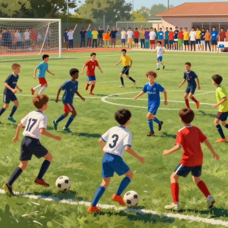 Sponsoring youth sports tournament, energetic soccer field filled with young players and cheering crowds, colorful team uniforms, dynamic action poses, vibrant and lively energy with sunlight and motion blur, capturing enthusiasm and community spirit, painterly digital art.