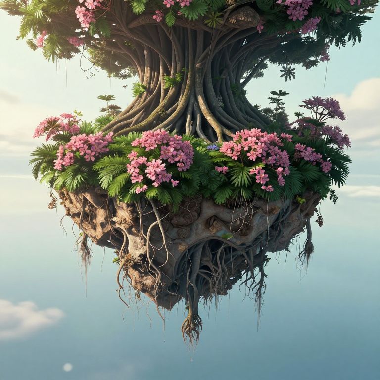 Fantastical floating tree with thick, twisted roots, adorned with vibrant pink flowers and lush green leaves, against a bright blue sky. Photorealistic
