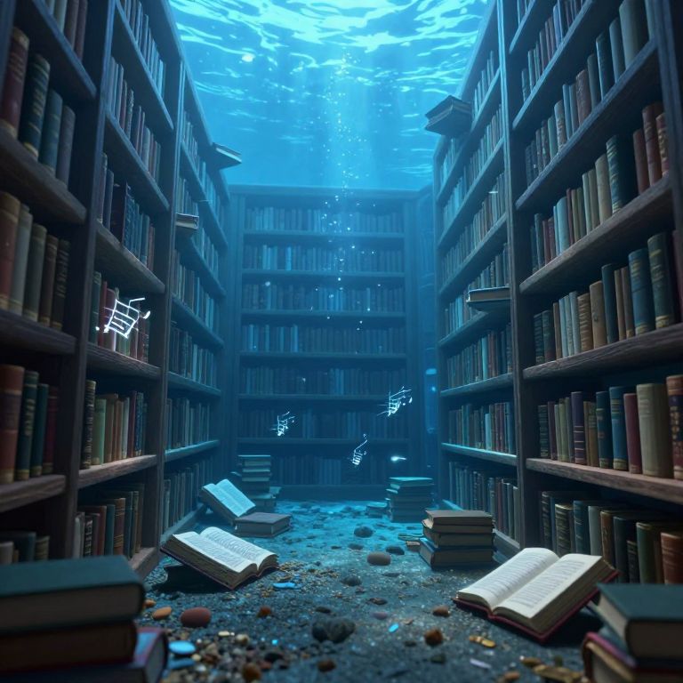 Photorealistic digital art: underwater library with blue-tinted water, bookshelves on both sides, scattered books, open books on the floor