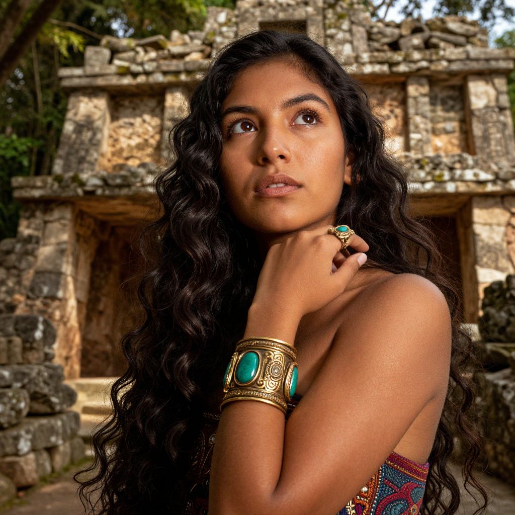 A hyperrealistic portrait captures the enigmatic allure of a South American woman with dark, wavy hair cascading down to her waist. Her olive skin glows in the warm, golden light filtering through lush foliage, as she stands amidst the ruins of an ancient Incan temple. Lost in thought, her intense brown eyes reflect a deep sense of curiosity and history. Photographed from a low angle, the focus is drawn to the intricate details of her handcrafted jewelry - ornate gold bracelets entwined with emerald-green stones - contrasting with the rugged texture of the ancient stone structure. This evocative portrait emphasizes the timeless beauty of her surroundings, transcending time and space.