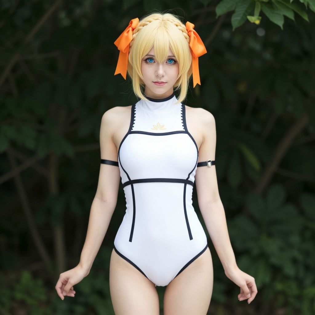 This is a digitally rendered image of a young woman with light blonde hair and blue eyes, dressed in a white, high-neck, sleeveless leotard with black trim. She has two bright orange hair ribbons tied on each side of her head. Her skin is fair, and she stands against a dark, leafy background. The leotard is form-fitting, accentuating her slender figure and small breasts. She wears black arm bands, one on each upper arm. The lighting highlights her delicate features and smooth skin, giving a slightly glossy appearance. The overall style is realistic with a slight anime influence in her large eyes and hair.