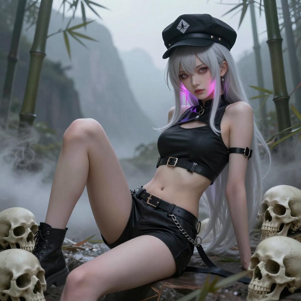 A digital artwork of a silver-haired woman in a black sleeveless top and pink shorts, reclining among white skulls and surrounded by mist. She wears black sandals and has one arm raised. The background features black bamboo patterns and a wooden screen. Her expression is confident, and the scene is illuminated by pink and purple lighting.