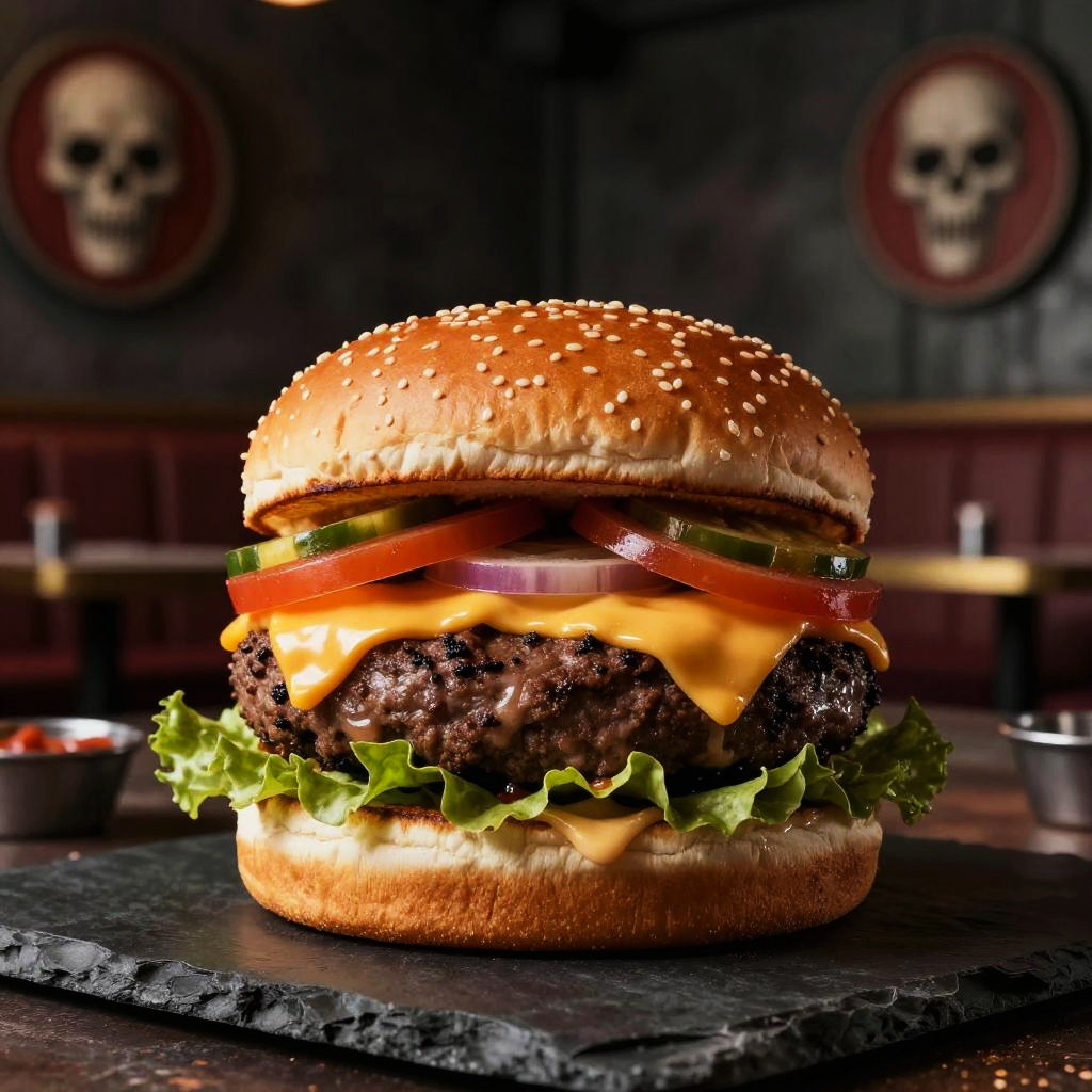 Nazi cheeseburger, dystopian restaurant scene with burger styled with ominous iconography, dark and gritty realism, cinematic shadows, detailed food textures
