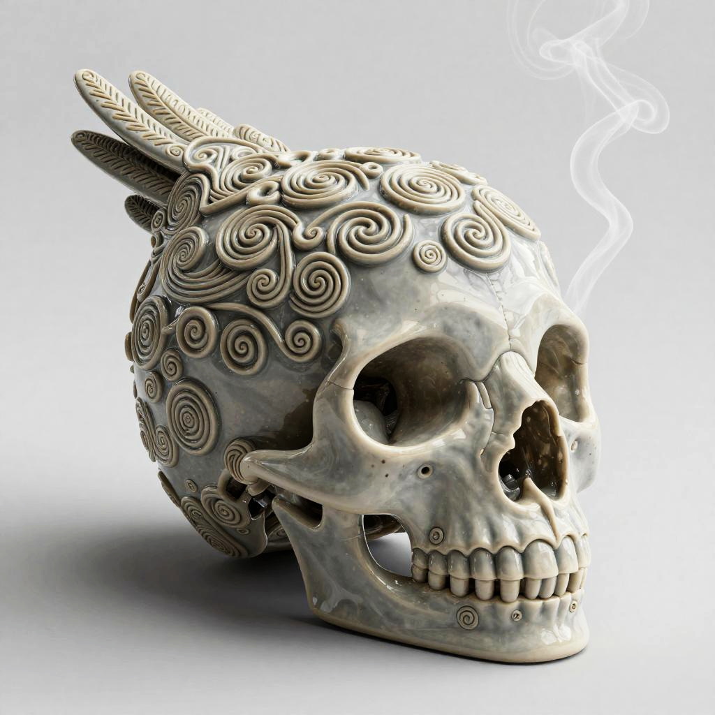 Realistic 3D render of ornately carved surrealist fox mask, delicate scrimshaw pattern of spiral fractal motifs, satin lacquered, deep magenta, octane render, 4k resolution