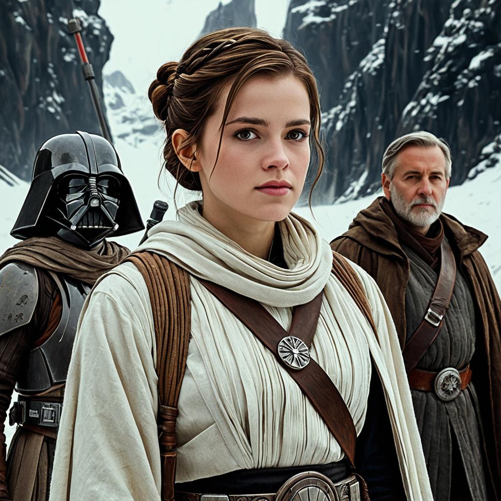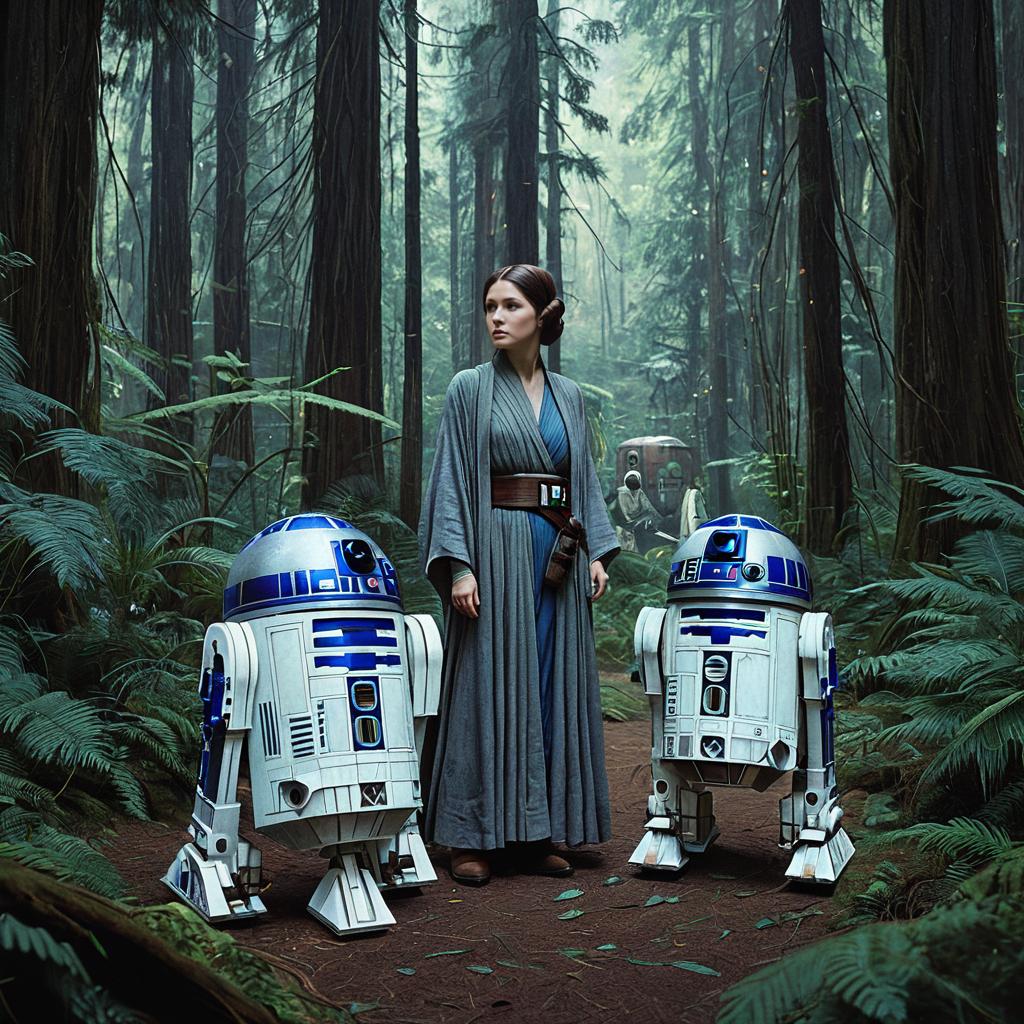 A hyper-realistic and highly detailed cinematic image depicting a female character dressed in traditional Star Wars robe attire standing between two R2-D2 units in a dense, misty forest resembling Endor. The environment is lush with tall trees and ferns, creating a mystical and immersive atmosphere reminiscent of the Star Wars universe.