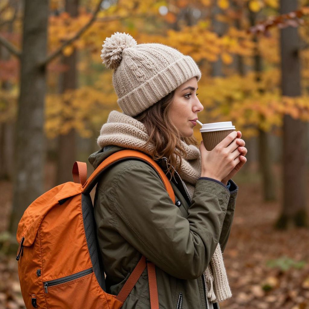 Woman enjoying a warm beverage while exploring a vibrant autumn forest, dressed in a cozy knit hat, scarf, and jacket, with an orange backpack slung over her shoulders.