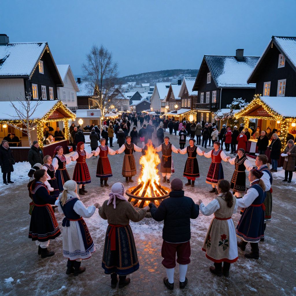Solheim winter festival in a charming village square, people in traditional Nordic costumes dancing around a large bonfire, snow-covered rooftops, twinkling fairy lights and frosted pine branches adorning the streets, lively cultural celebration with joyous expressions
