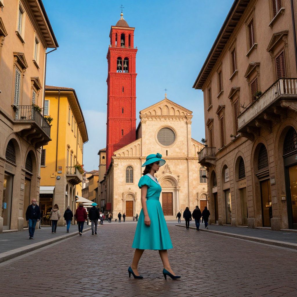 The image depicts a vibrant street scene in Bologna, Italy, captured in a surreal, almost dreamlike style reminiscent of Giorgio de Chirico's work. A woman in a striking turquoise dress and matching hat strides confidently down the cobblestone street, her figure standing out against the backdrop of historic buildings. The architecture includes a prominent red bell tower and a beige church with arched windows, both towering above the street level. The scene is bathed in a mix of warm and cool colors, with the red of the bell tower and the blue sky contrasting sharply against the beige and yellow buildings. The overall composition is balanced, with the woman's figure centrally positioned, drawing the viewer's eye through the scene. The street is lined with people, adding a sense of scale and activity to the scene. The interplay of light and shadow, along with the detailed textures of the buildings and cobblestones, creates a rich, immersive atmosphere.