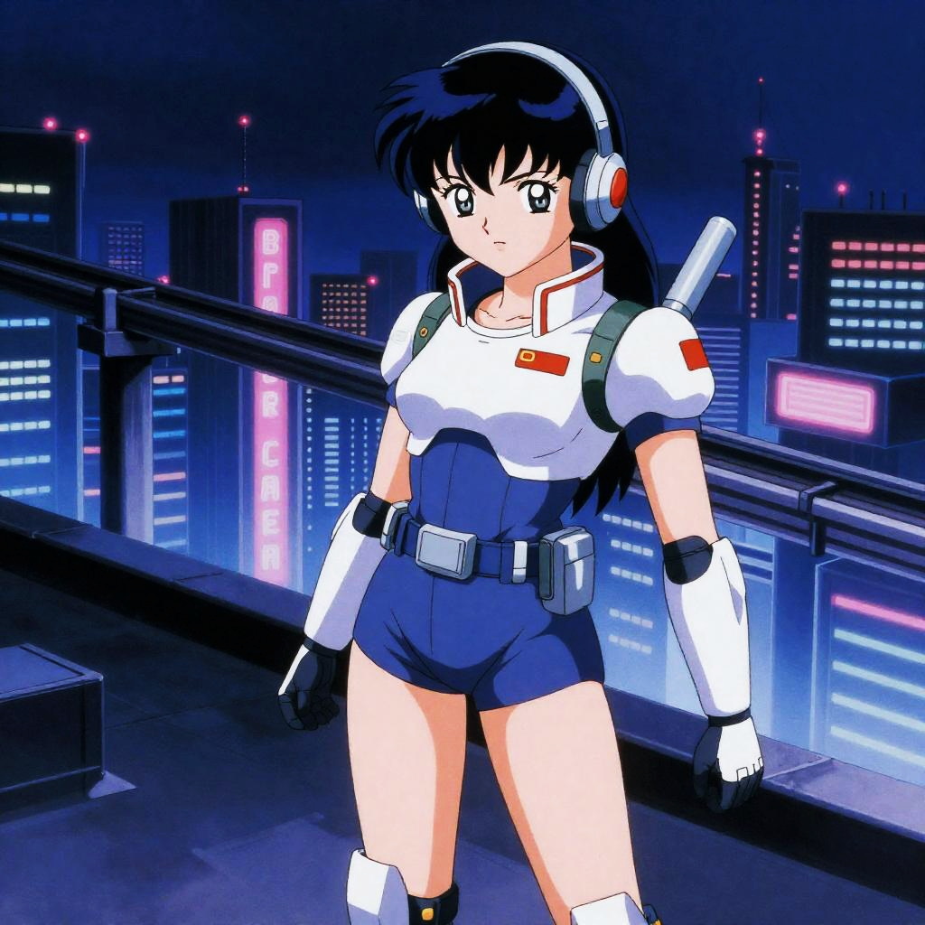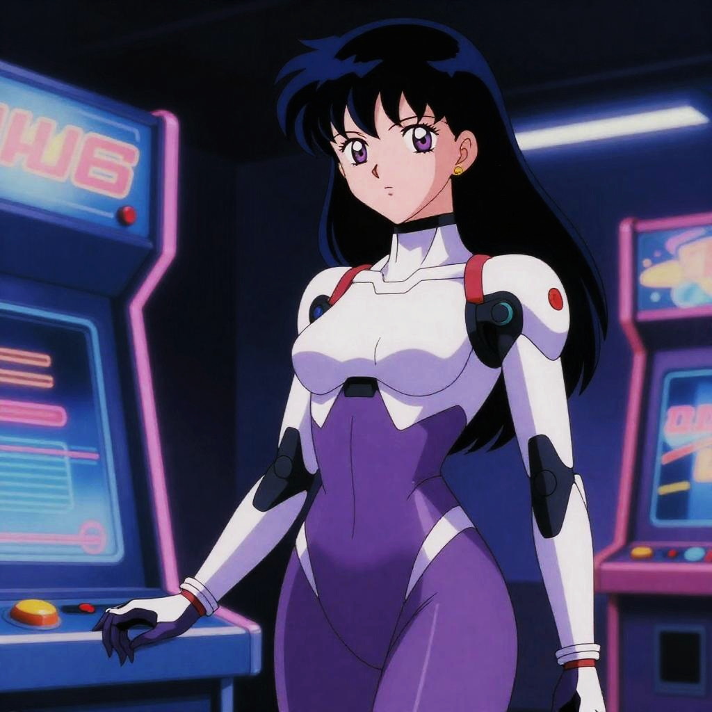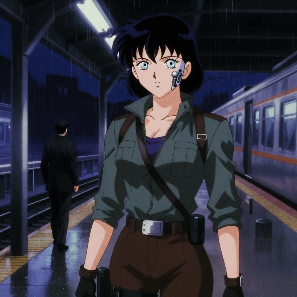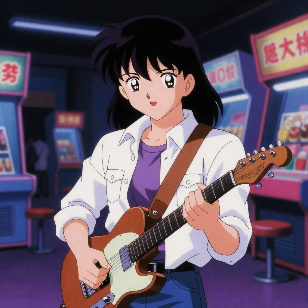 1990s anime featuring a rogue android street musician at a neon-lit arcade at midnight, neo-noir anime, in VHS grain, saturated neon, cel animation