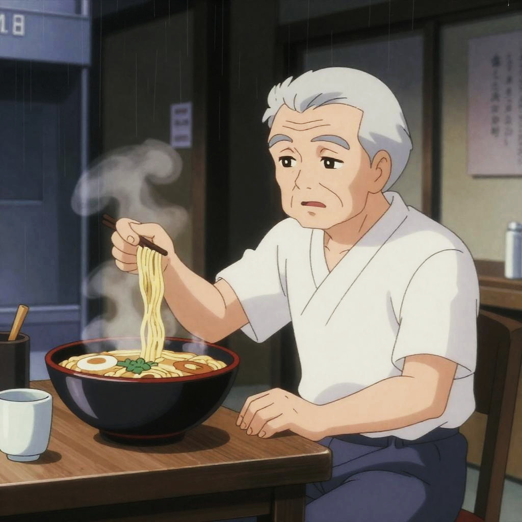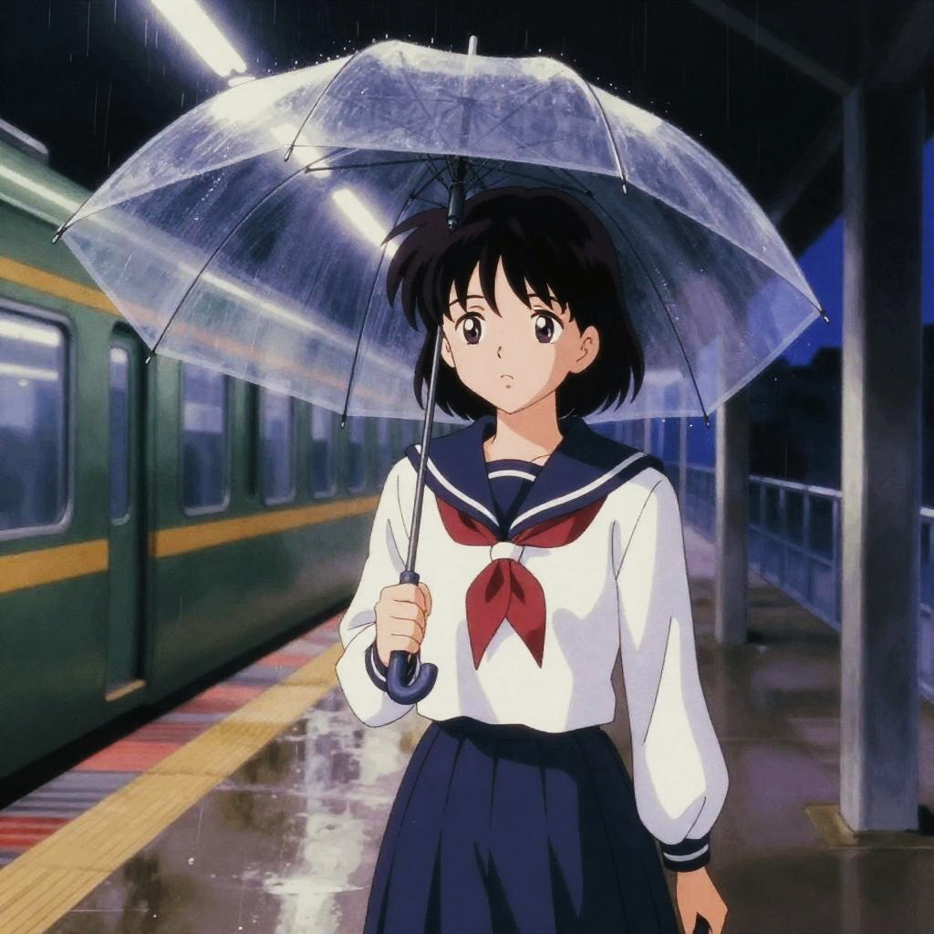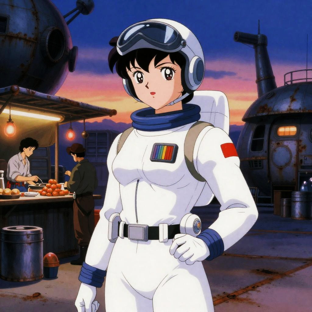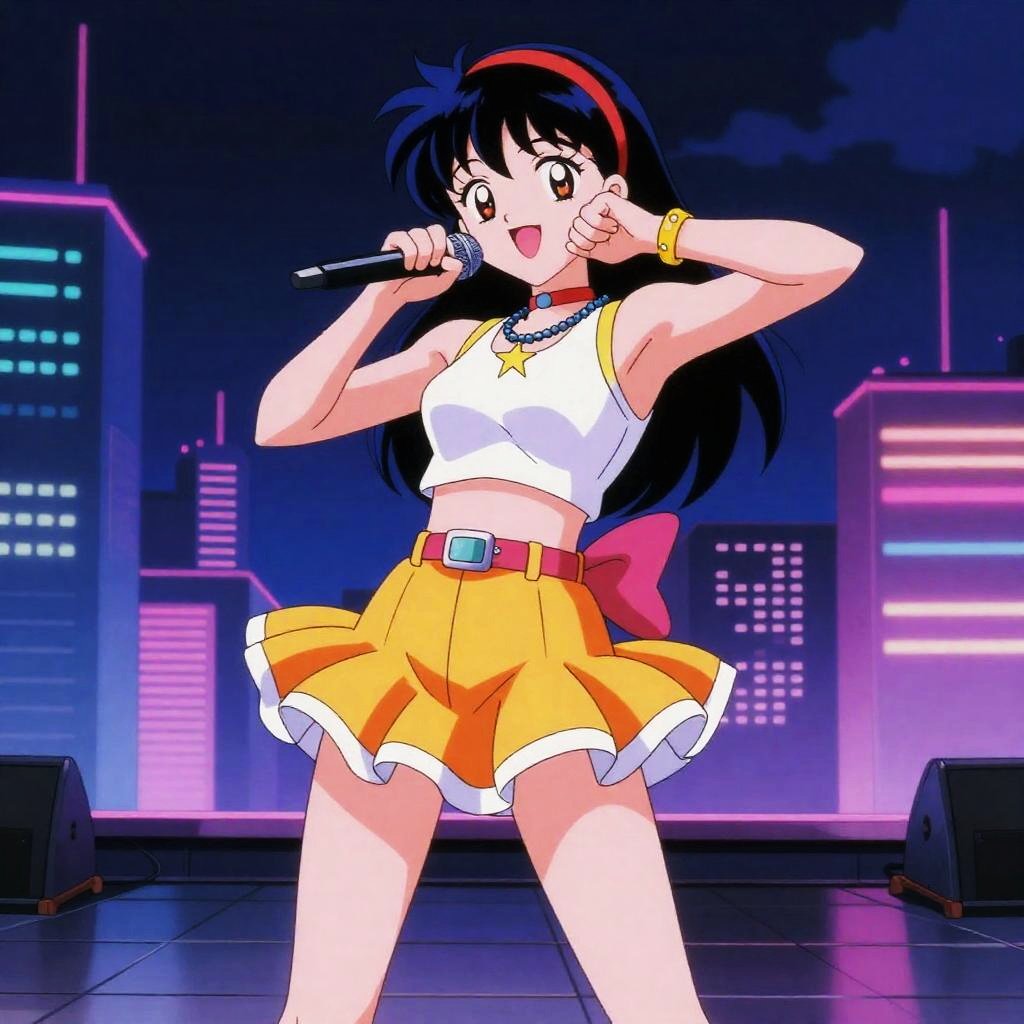 1990s anime featuring a rogue android street musician at a neon-lit arcade at midnight, neo-noir anime, in VHS grain, saturated neon, cel animation