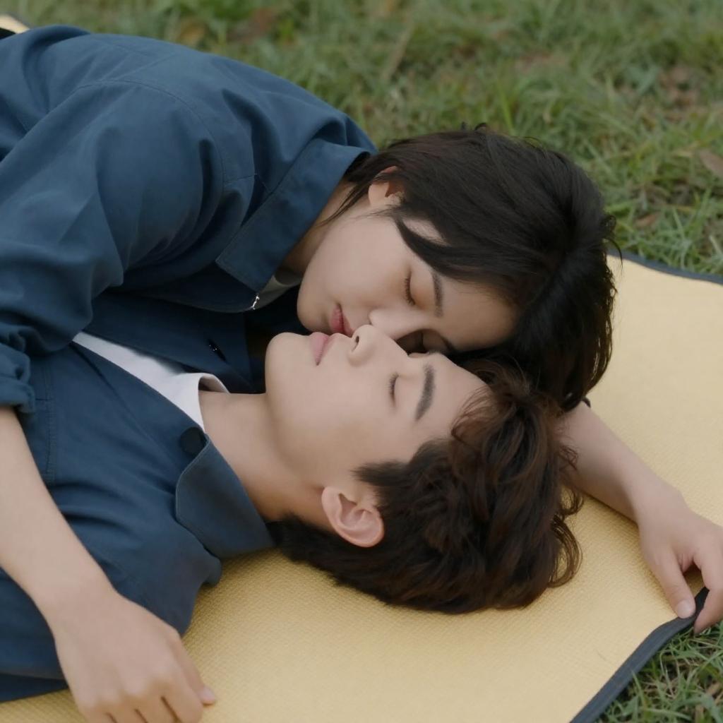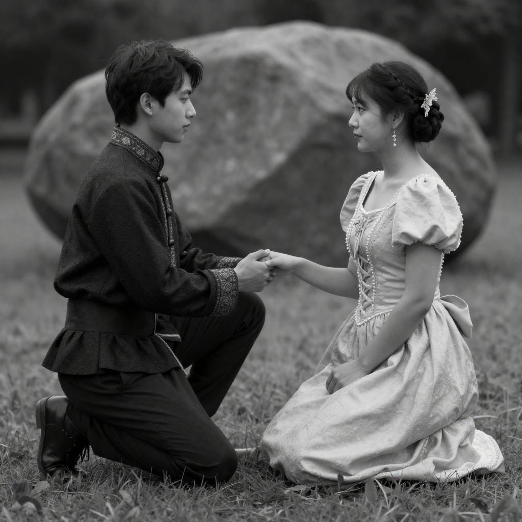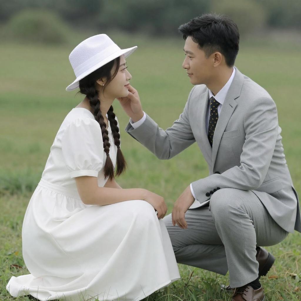 Photograph of a grassy field with yellow wildflowers. A woman in a white dress with a lace veil stands, while a man in a black suit and white shirt lies on the ground, looking up at her. A house with a sloped roof and green hills are in the background. Trees frame the scene.