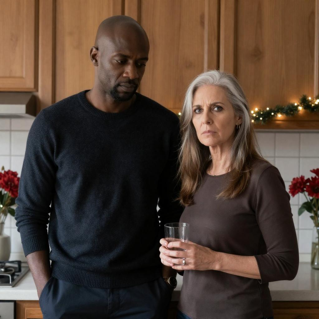 Photograph of two Black people, a bald man and a woman with short curly hair. The man in a red shirt and Christmas sweater with white snowflakes looks to the side. The woman in a red Christmas sweater and Santa hat holds colorful string lights, looking confused. Background has yellow walls and windows. Both wear festive clothing. Woman holds string lights in her right hand. Man stands to the left, woman to the right.