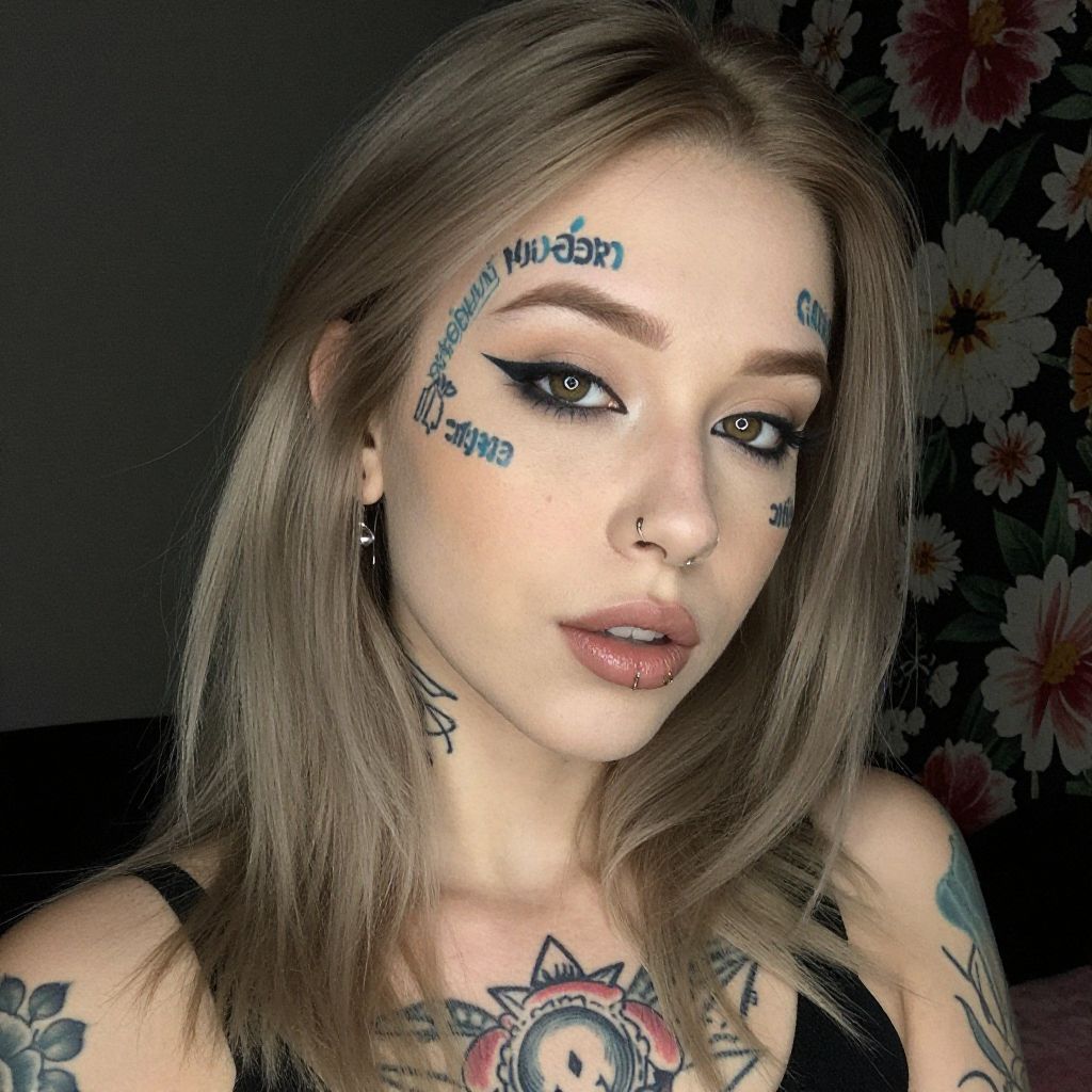 Photograph of a young woman with light blonde hair, fair skin, and multiple tattoos. She has black eyeliner, a nose ring, and a lip piercing. Her face is adorned with blue and black tattooed designs, including text and a floral piece. She's wearing a black top, with a floral curtain in the background. The lighting is soft, highlighting her tattoos and facial features.