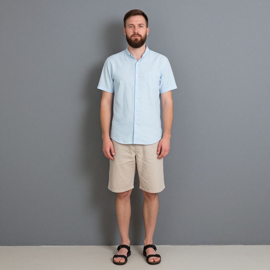 A photograph of a bearded, Caucasian man standing against a plain gray wall. He has short brown hair and is wearing a light blue, short-sleeve button-up shirt, beige knee-length shorts, and black sandals. His stance is relaxed with his arms slightly away from his body. The floor is light gray, adding to the minimalist, indoor setting.
