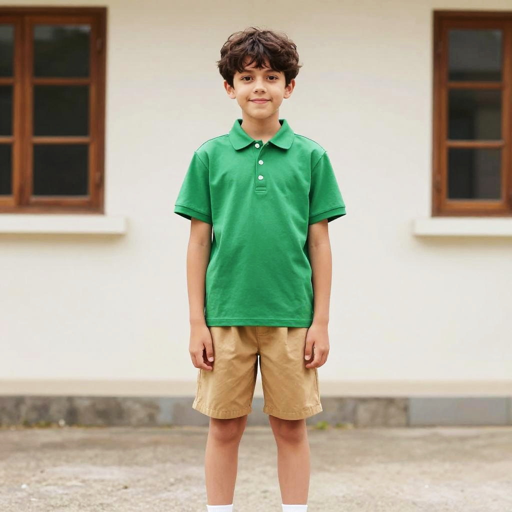 Full-length portrait of a young boy standing outdoors in front of a light-colored building with two windows. The boy has curly dark hair, wears a green polo shirt and tan shorts, paired with white socks. The setting appears to be a residential or school area with a concrete ground surface.